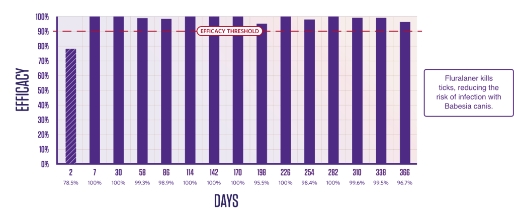 Persistent Rhipicephalus sanguineus tick-killing activity from Day 4 after treatment for 12 months. Newly infested R. sanguineus ticks are killed within 48 hours.3,4
