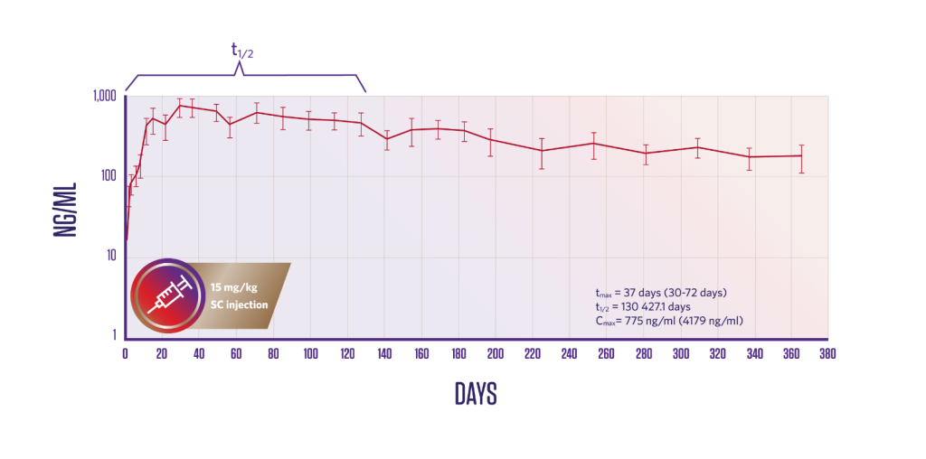 A margin of safety study was performed and demonstrated safety at doses of 1X (15 mg/kg), 3X (45 mg/kg) and 5X (75 mg/kg) the standard therapeutic dose administered every 4 months for a total of 6 doses. The only treatment-related finding was limited to injection site swellings that resolved over time.