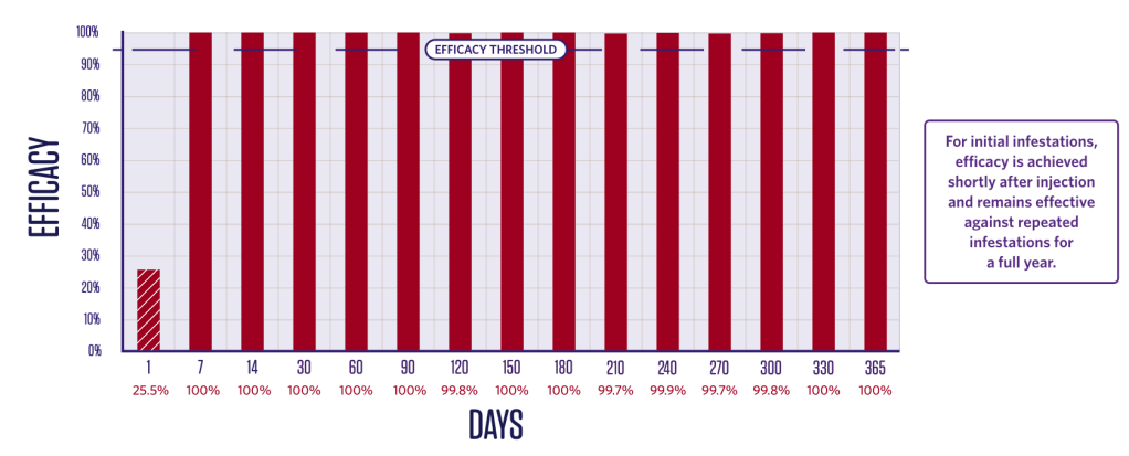 Because the efficacy is sustained for an entire year following administration, dogs can be treated whenever they are unprotected against fleas and ticks. Dogs will not require another dose of flea and tick treatment for 12 months* for the indicated parasites.