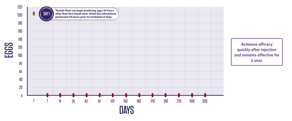 The flea lifecycle is broken due to the rapid onset of action and long-lasting efficacy against adult fleas on the animal and the absence of viable egg production.3